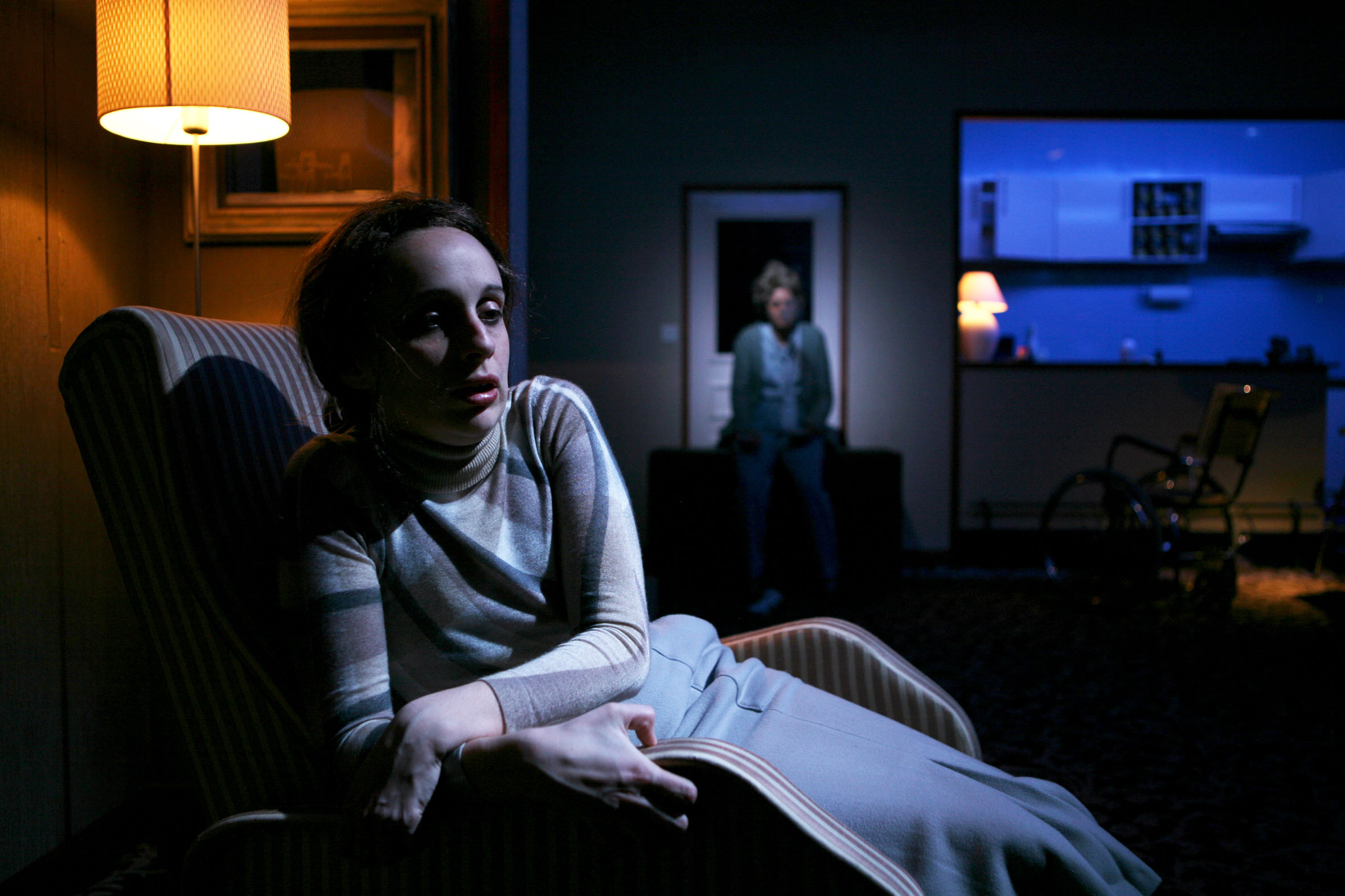On the stage, a life-size house, a huge box, hermetically separated from the audience by a large bay window: an open window to the apartment of Sally R, a young woman on the brink of suicide. Only her shadow is visible through the closed drapes of her apartment. The moment passes, and they open to reveal four women, who are improvising, despite their sadness, the wake of one of them: young Sally B, who has been found dead, burned on her sun bed. The audience, relegated to the position of voyeurs by the distance that the staging imposes, witnesses an inquiry during which four women try to answer the same question: what am I in the process of witnessing?