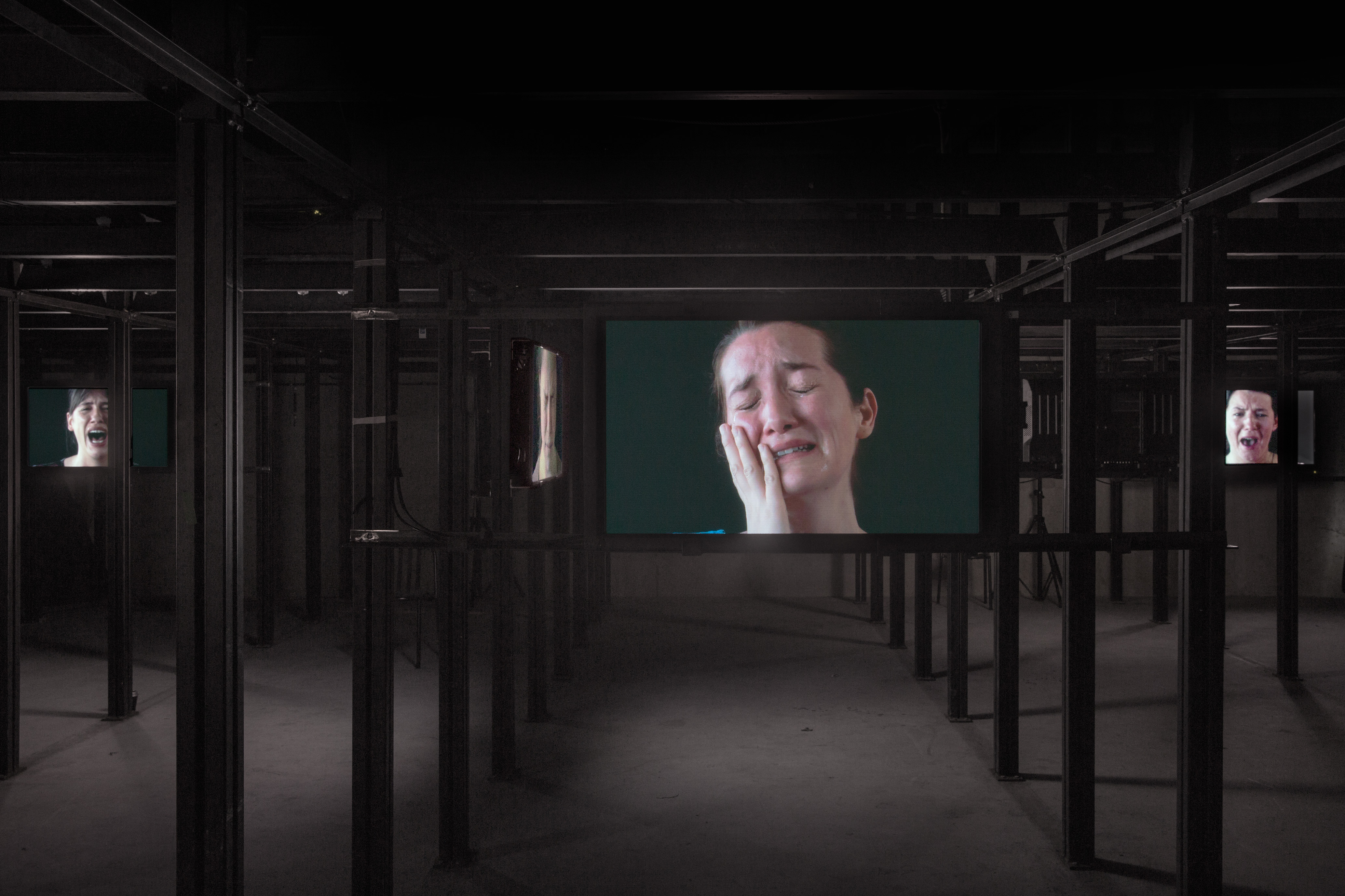 In STILL TOO SAD TO TELL YOU, ten screens invite you to an intimate experience where tears, as they are put on display, also beg to be collected. Faces may become stages and landscapes depending on whether your vision blurs, a tear forms, you break into tears or sob, you cry a river or a torrent, you wipe or share your tears, in silence, in gasps, in deep sighs, loud, short or long cries interspersed with words, whole or truncated, whether you suffocate or drown…
